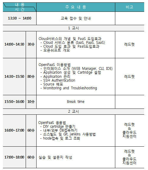 미래부와 정보통신 산업진흥원에서 운영하는 클라우드지원센터의 SW개발환경인 [OpenPaaS]를 효과적으로 이용할 수 있도록 개발자 활용교육을 실시하려고 합니다. OpenPaaS회원님들 뿐 아니라 PaaS(Platform s a Service) 에 대해서 관심있는 많은 개발자/기획자 분들의 많은 참여바랍니다.