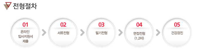 서류전형→필기전형→면접전형(1,2차)→건강검진 → 합격자발표입니다.