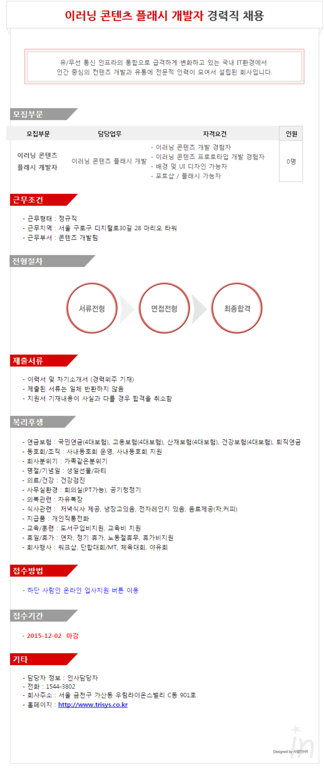 | [7291] [트리시스㈜]이러닝 콘텐츠 플래시 개발자 경력직 채용모집(~11/30) |